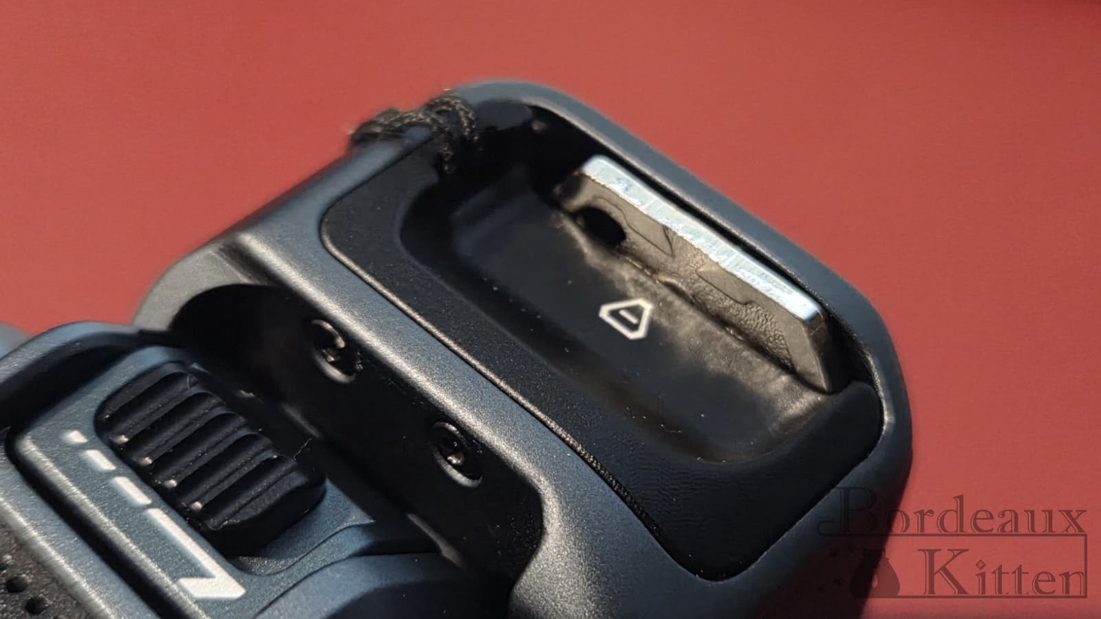 アルミケージのグリップ装着側の下にはバッテリーパック交換用に側面を開閉できるつまみがついている。これのおかげでグリップを装着したままバッテリー交換ができるという仕様である。