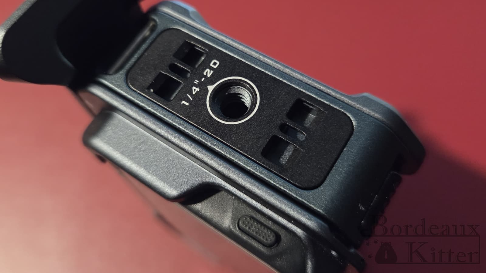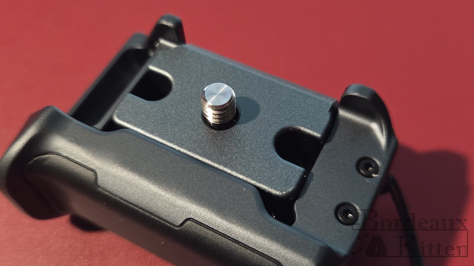 アルミケージは純正アクセサリだけあって作りが良く、正面から見て左側面にはクイックリリースキットの着脱部と1/4ネジ穴が切ってあってこれ単体で三脚や自撮り棒なんかに縦向きで装着できるのがうれしい。